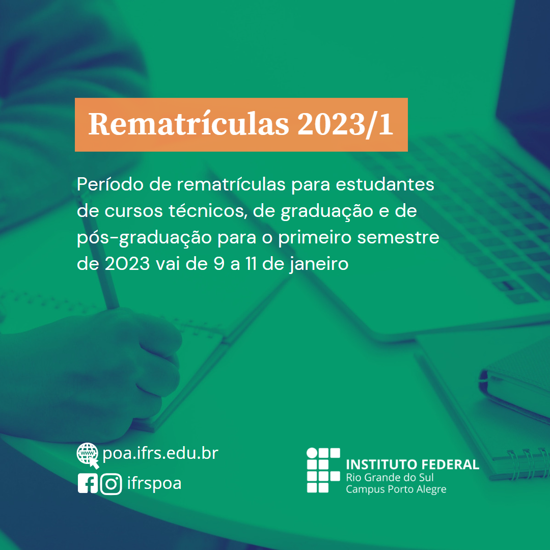 REMATRÍCULAS 2023/1: As rematrículas para o semestre 2023/1 ocorrem no período de 09 a 11 de janeiro de 2023 e devem ser feitas on-line, por meio dos respectivos sistemas acadêmicos...