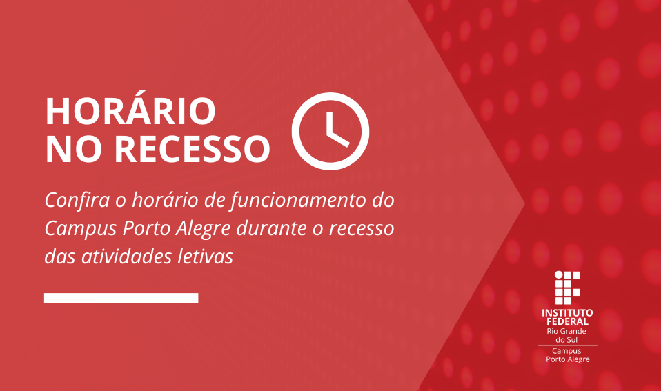 Em consonância com as orientações Portaria IFRS nº 659 de 15 de novembro de 2022 e conforme a Portaria Campus Porto Alegre nº 387, de 25 de novembro 2022, o expediente será reduzido...