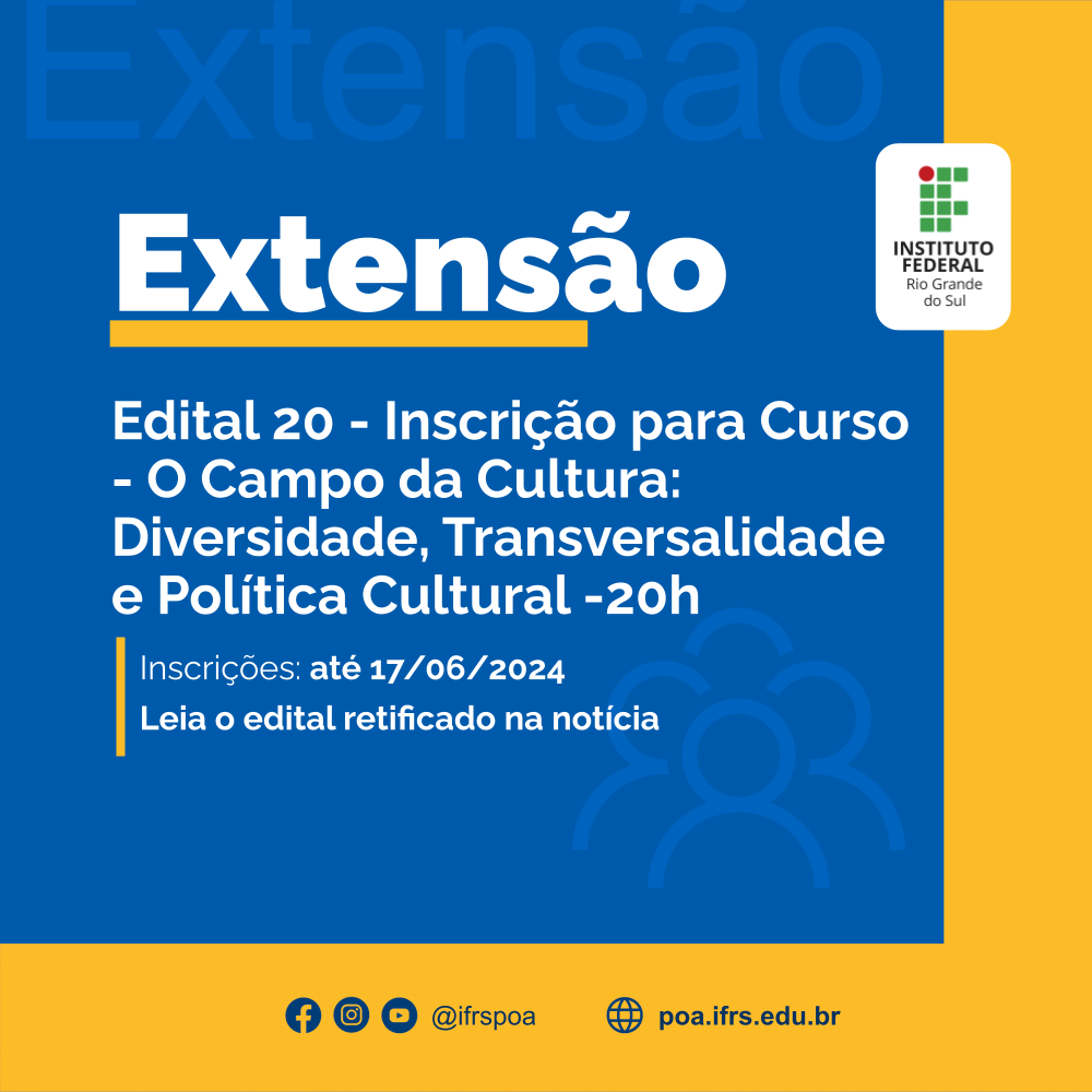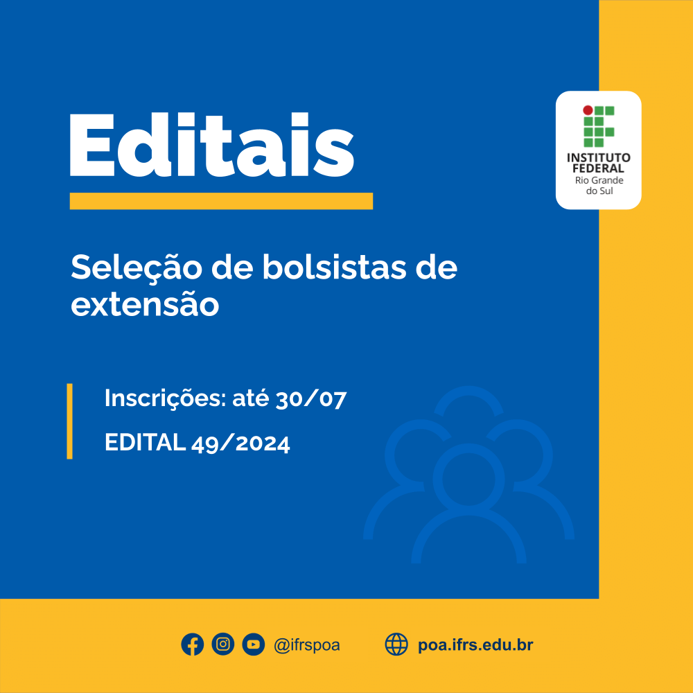 Está aberta a seleção para bolsistas de Extensão do Campus Porto Alegre, através do Edital 49/2024, de Apoio a Projetos de Extensão Voltados ao Enfrentamento da Situação de...