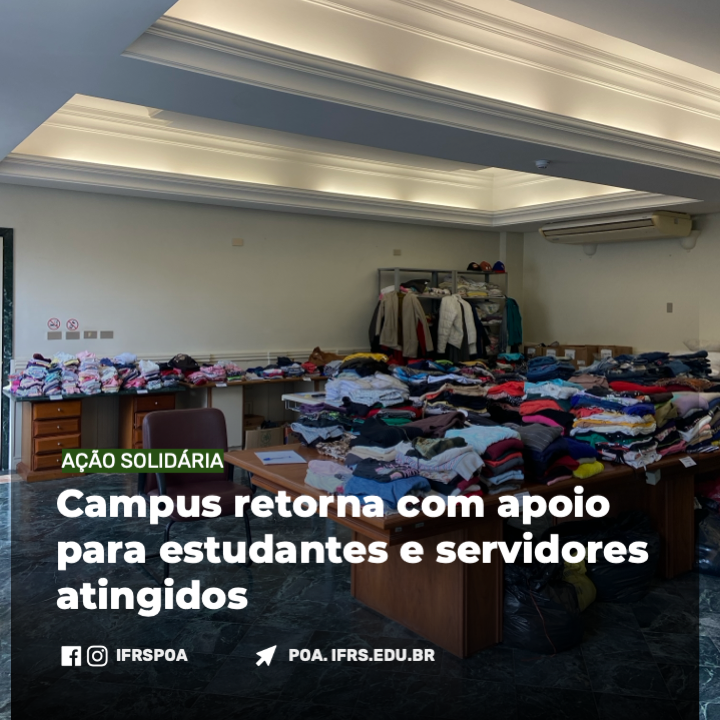 Após retorno à sede do Campus POA, o espaço destinado às doações de roupas, cestas básicas e materiais de limpeza à comunidade atingida, passou a ser no 9 andar da Torre Norte....
