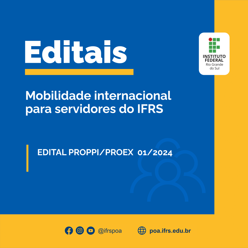 Encontra-se aberto o Edital PROPPI/PROEX No 01/2024, voltado à mobilidade internacional de servidores do IFRS. A mobilidade deverá ter a duração de, no mínimo, 10 dias e, no máximo,...