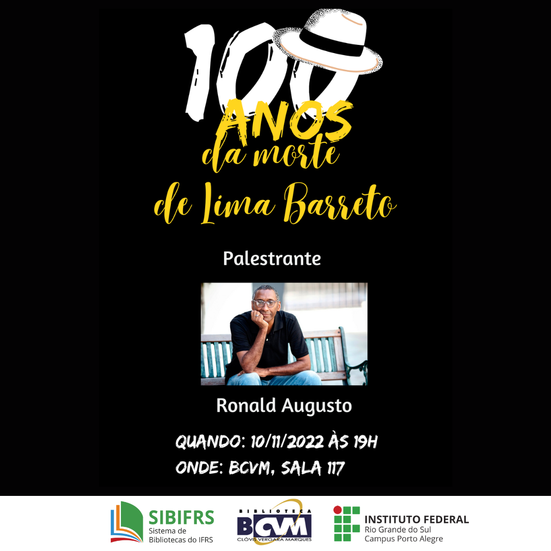 A Biblioteca Clóvis Vergara Marques (BCVM), do IFRS - Campus Porto Alegre, convida para o evento cultural "100 anos da morte de Lima Barreto", que ocorrerá na BCVM no dia 10 de novembro...