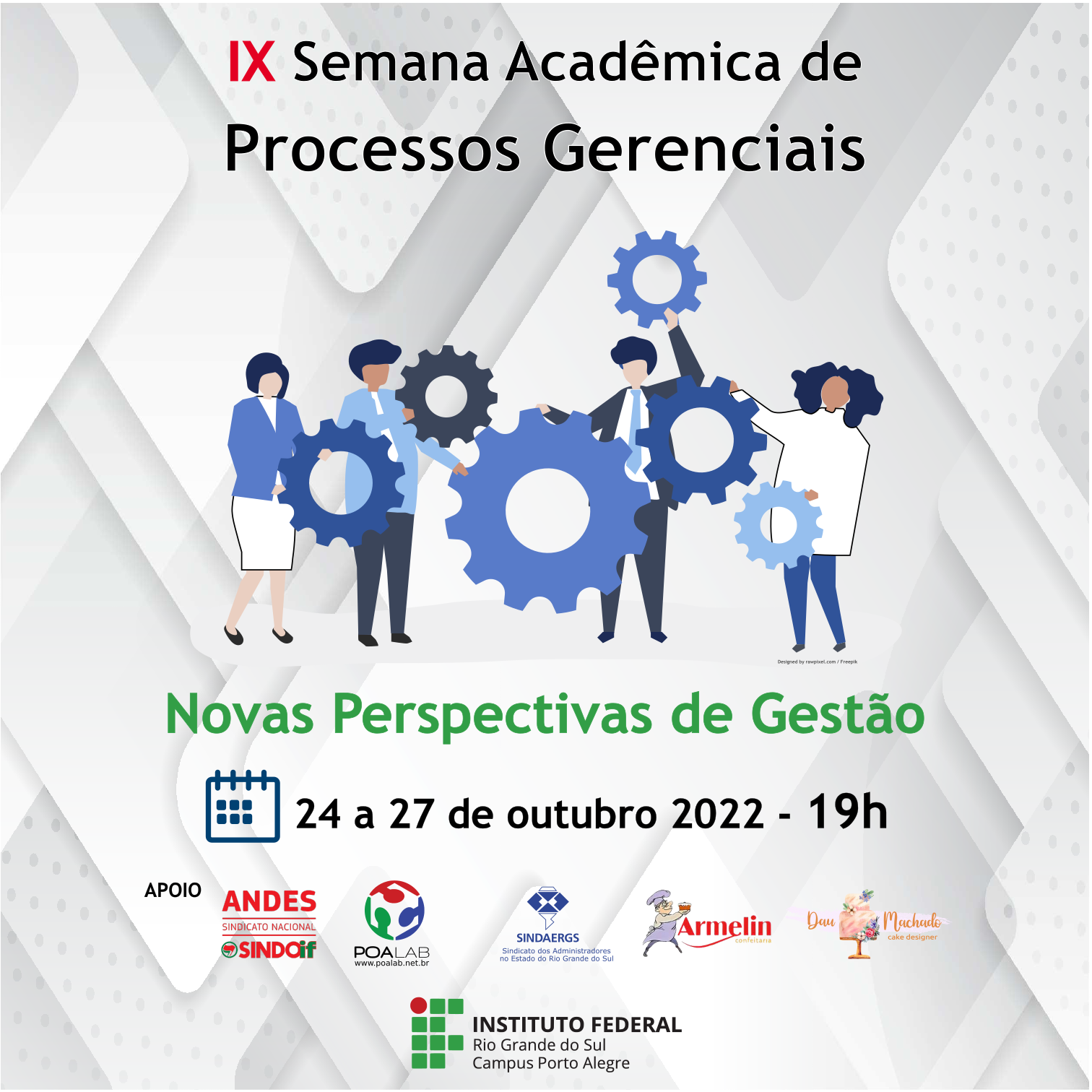 Acontece de 24 a 27 de outubro de 2022 a IX Semana Acadêmica do Curso Superior de Tecnologia em Processos Gerenciais, no Auditório da Torre Sul (sala 923), do IFRS - Campus Porto...