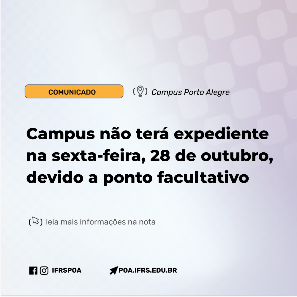 Nesta sexta-feira, 28 de outubro de 2022, Dia do Servidor Público, o Campus Porto Alegre do Instituto Federal do Rio Grande do Sul (IFRS) terá ponto facultativo, considerando a Portaria...