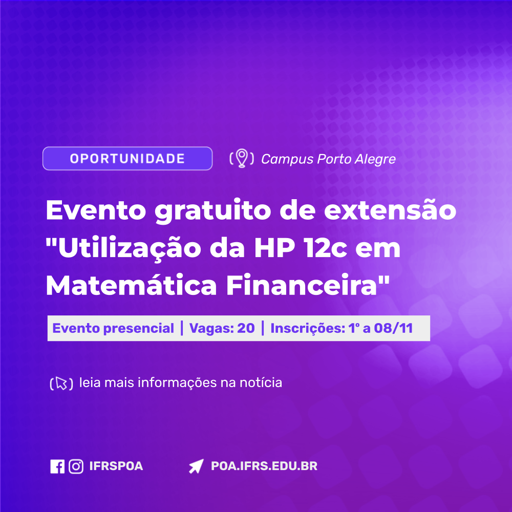 Estão abertas de 1º a 8 de novembro as inscrições para o evento de Extensão "Utilização da HP 12c em Matemática Financeira". Gratuito, tem como propósito abordar a utilização...