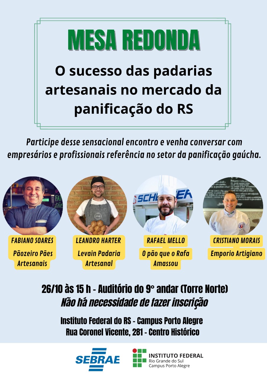 O curso Técnico em Panificação do IFRS - Campus Porto Alegre promove nesta quarta-feira, 26 de outubro, às 15h, mesa-redonda com o tema "O sucesso das padarias artesanais no mercado da...