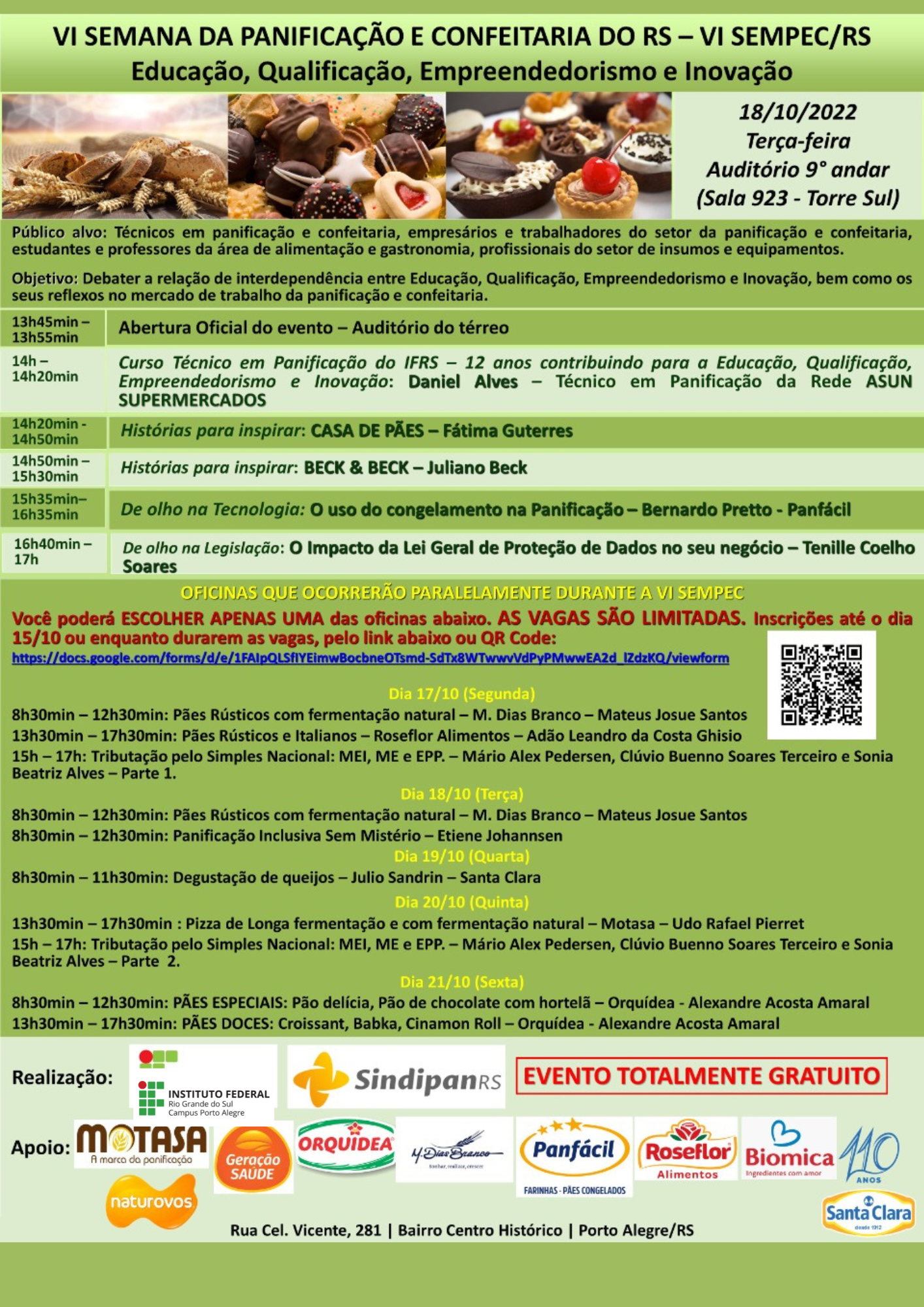 De 17 a 21 de outubro de 2022, o curso Técnico em Panificação do IFRS - Campus Porto Alegre em parceria com o Sindicato das Indústrias de Panificação e Confeitaria e de Massas...