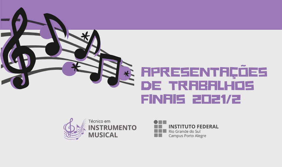 O curso Técnico em Instrumento Musical do IFRS - Campus Porto Alegre convida a comunidade para prestigiar as apresentações dos trabalhos de final de curso produzidos na disciplina...