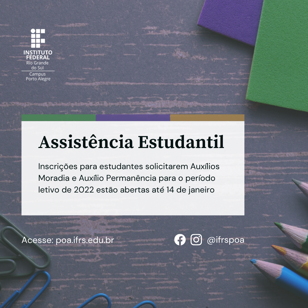 Estão abertas de segunda-feira, 03 de janeiro, até 14 de janeiro, sexta-feira, as inscrições da Etapa 1 do Programa de Auxílios de Assistência Estudantil - Edital nº 46/2021, para o...