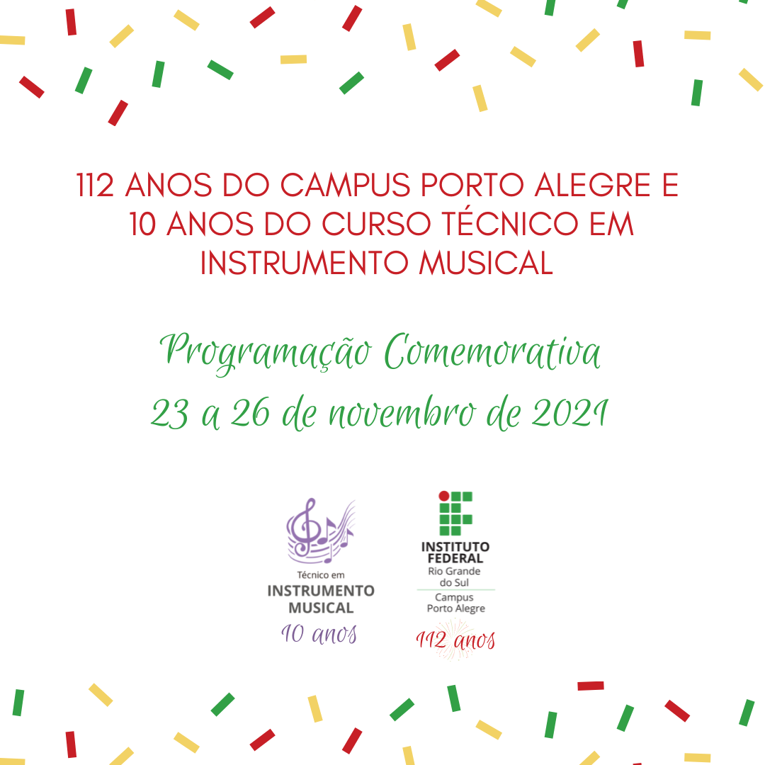 De 23 a 26 de novembro de 2021 estão programadas diferentes atividades, todas virtuais, em comemoração aos 112 anos do Campus e aos 10 anos do curso Técnico em Instrumento Musical