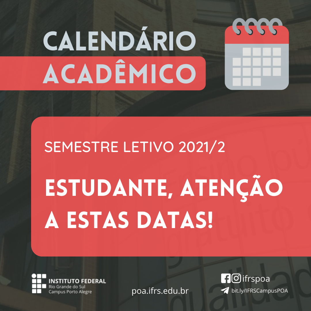 Estudante do #IFRSCampusPOA: fique ligada/o nestas datas! #CalendárioAcadêmico #SegundoSemestre2021 #EnsinoRemoto De acordo com o calendário acadêmico, as rematrículas...