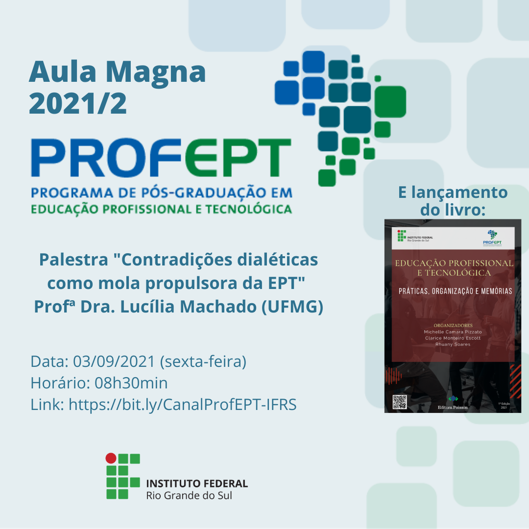 Acontece na próxima sexta-feira, 03 de setembro, às 8h30min, de forma virtual, a Aula Magna 2021/2 do curso de Mestrado Profissional em Educação Profissional e Tecnológica (ProfEPT) do...