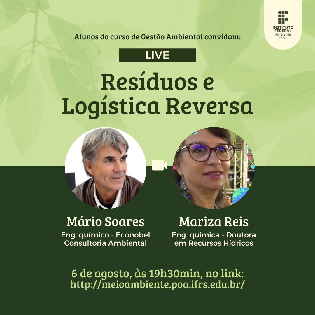 Acontece na sexta-feira, dia 06 de agosto, às 19h30, a live "Resíduos e Logística Reversa", organizada pelos alunos do Curso Superior de Tecnologia em Gestão Ambiental do IFRS -...