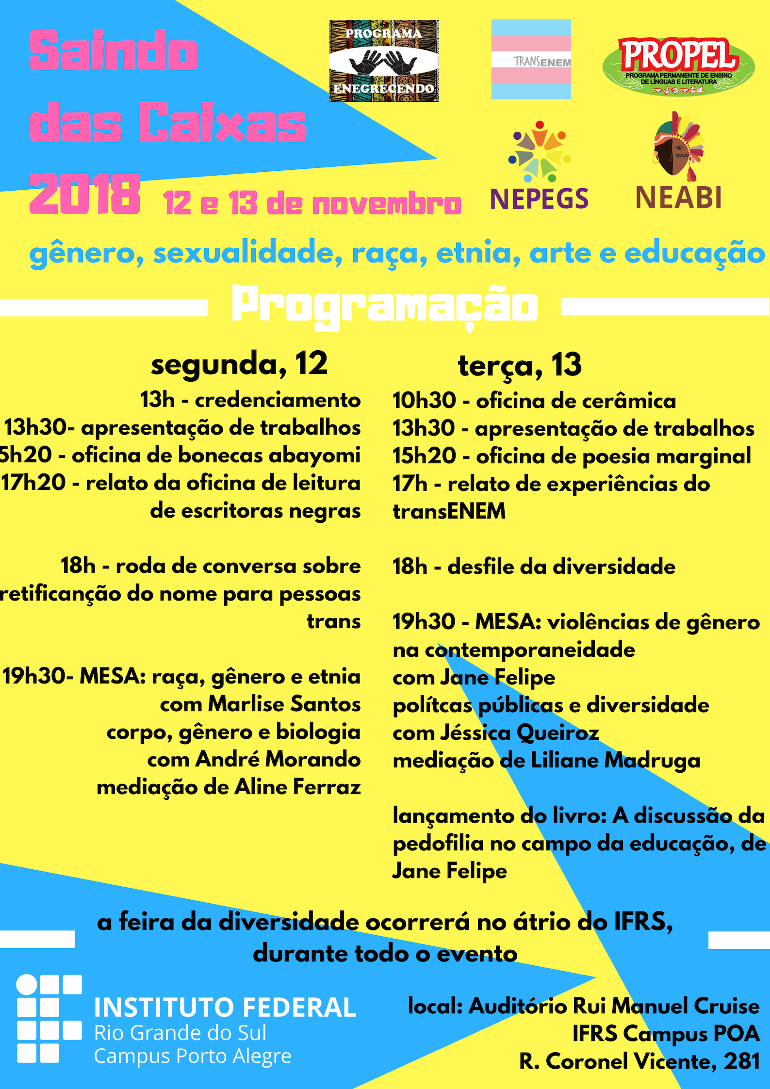 O Núcleo de Estudos e Pesquisas em Educação, Gênero e Sexualidade (NEPEGS) do IFRS - Campus Porto Alegre promove nos dias 12 e 13/11 o Seminário Saindo das Caixas - Edição...