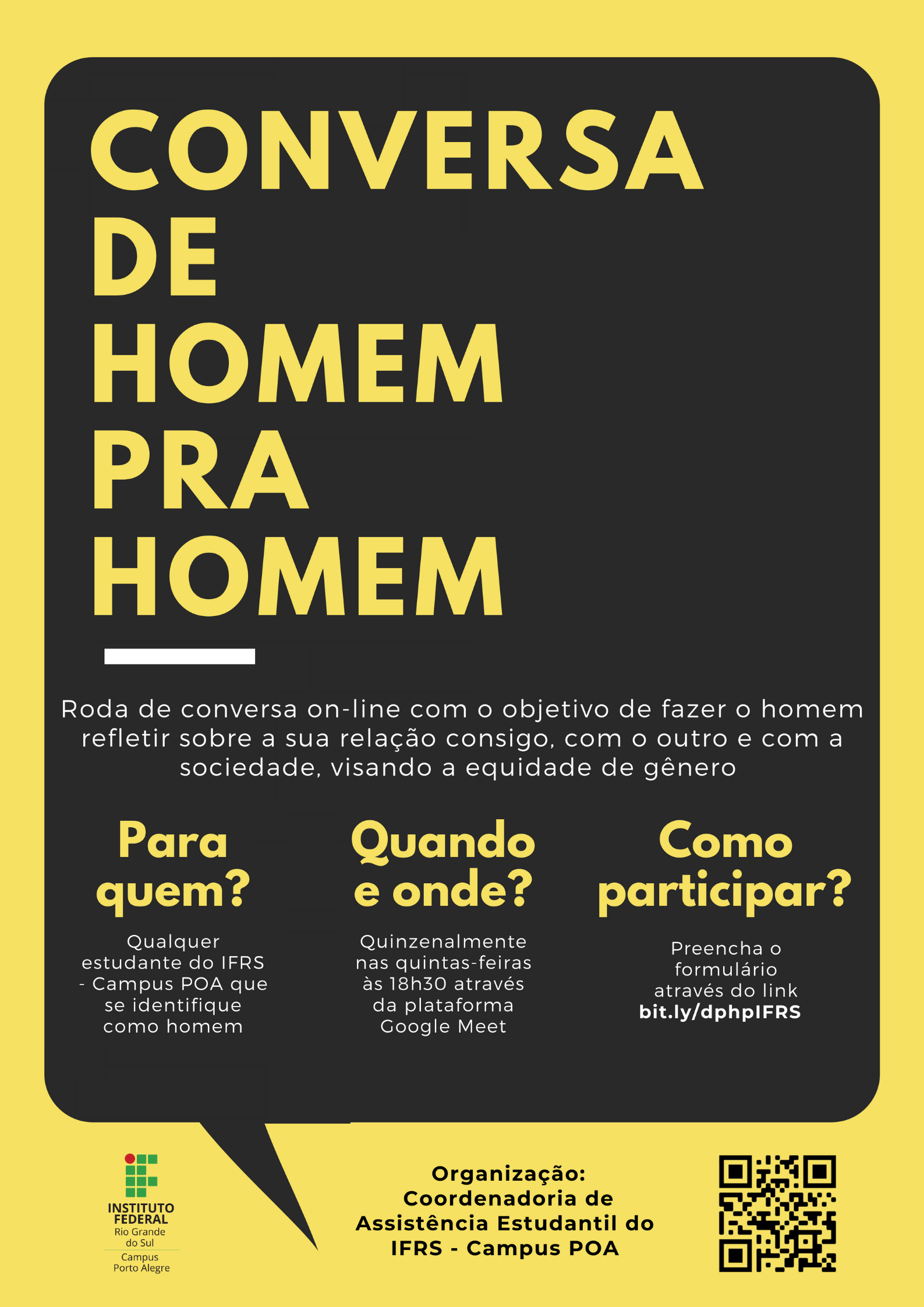 Seguindo movimentos que têm ganhado força no Brasil, a Coordenadoria de Assistência Estudantil (CAE) do IFRS - Campus Porto Alegre lançou o projeto Conversa de Homem para Homem. Tal...