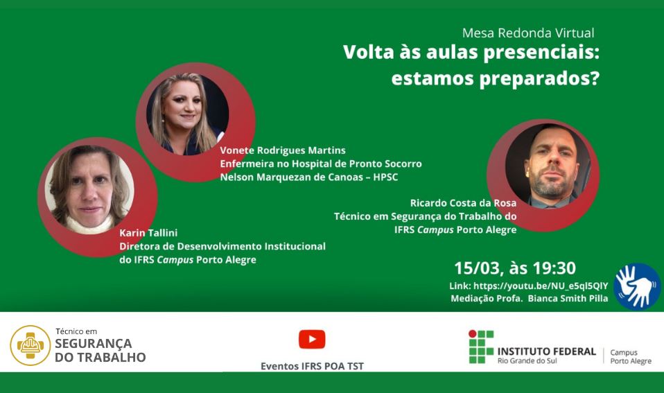O curso Técnico em Segurança do Trabalho do IFRS - Campus Porto Alegre promove na próxima segunda-feira, dia 15 de março de 2021, às 19h30min, a mesa-redonda virtual "Volta às aulas...